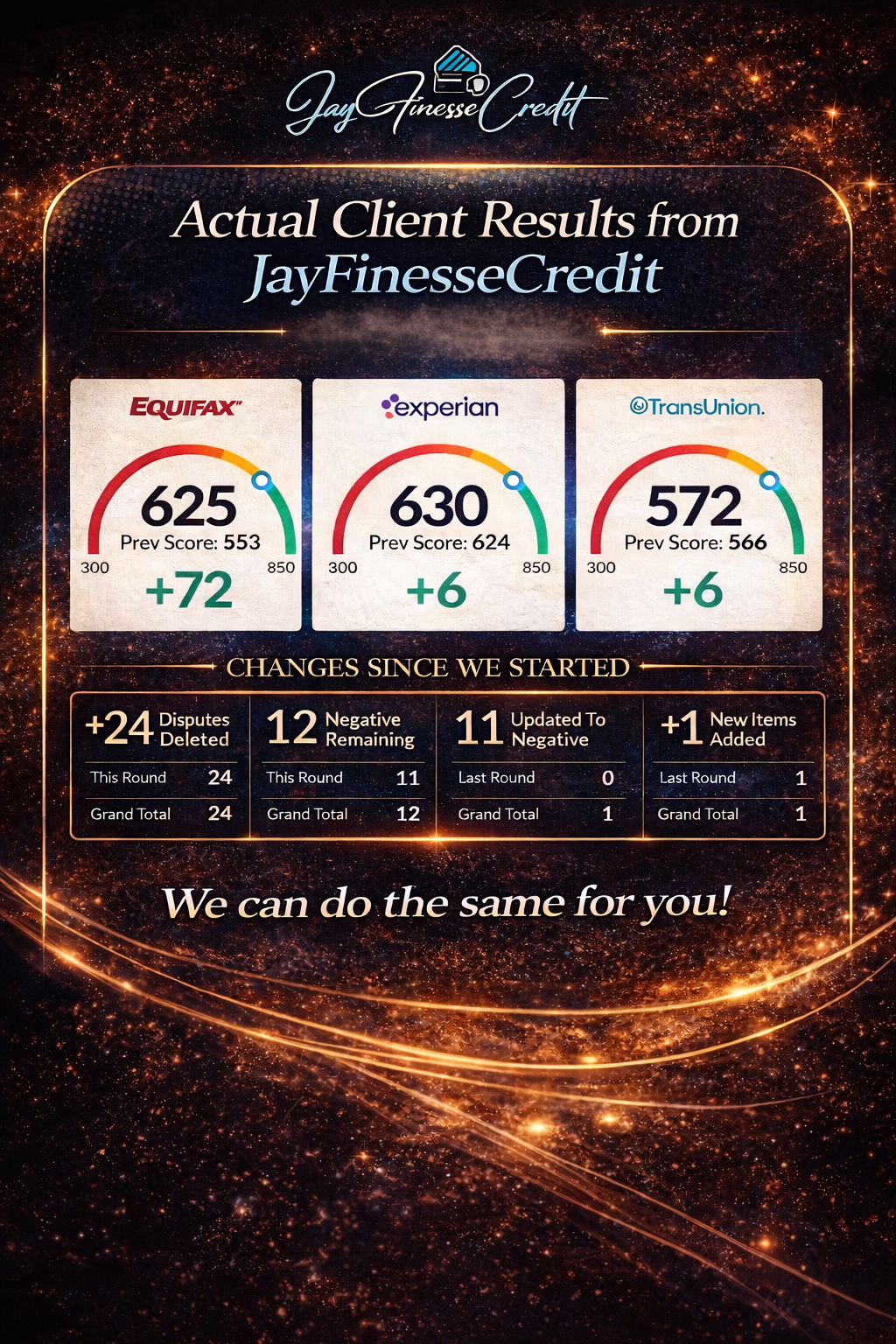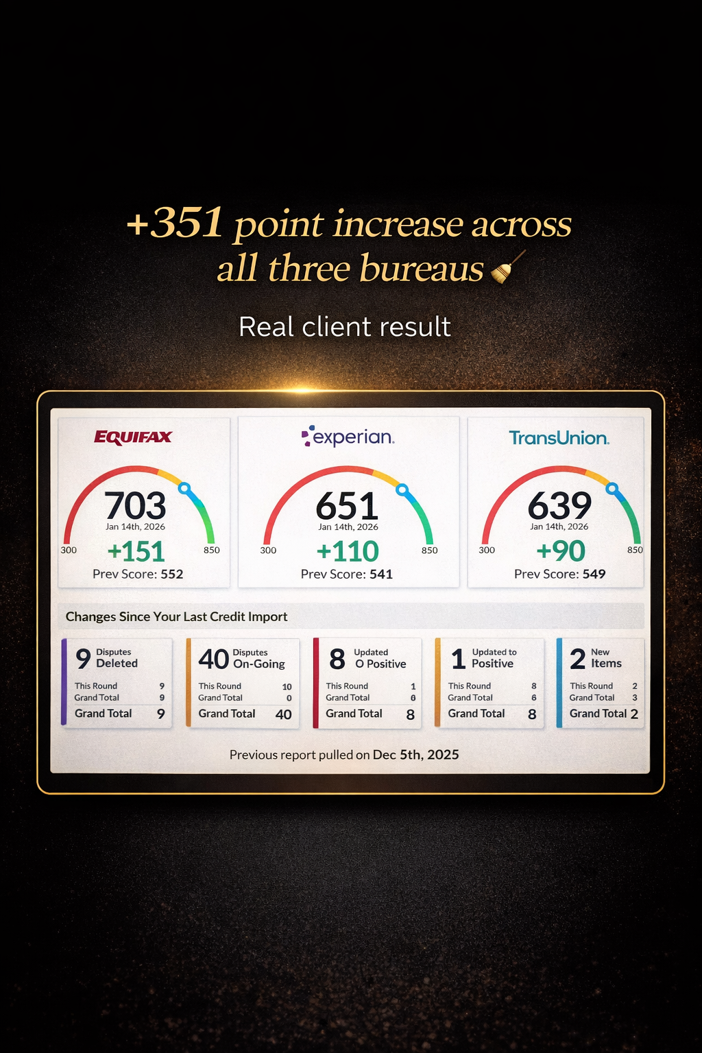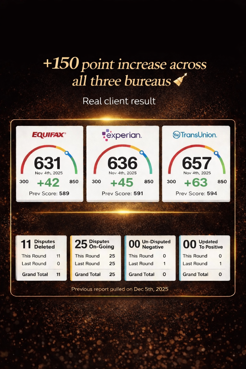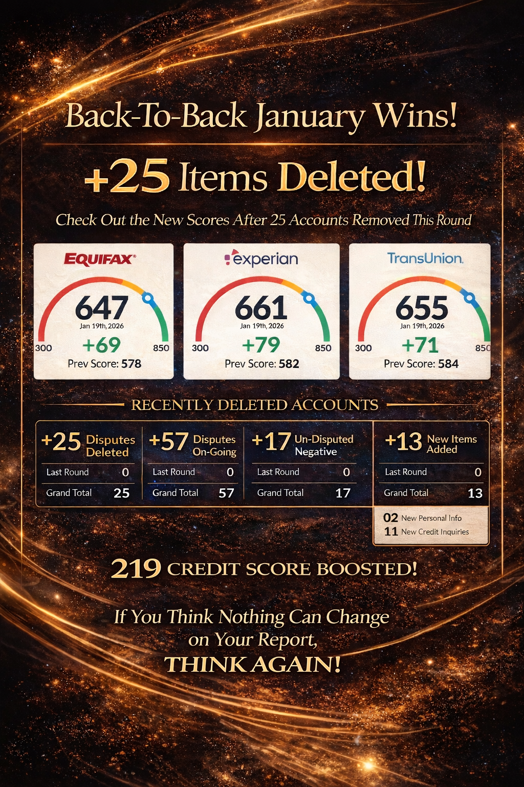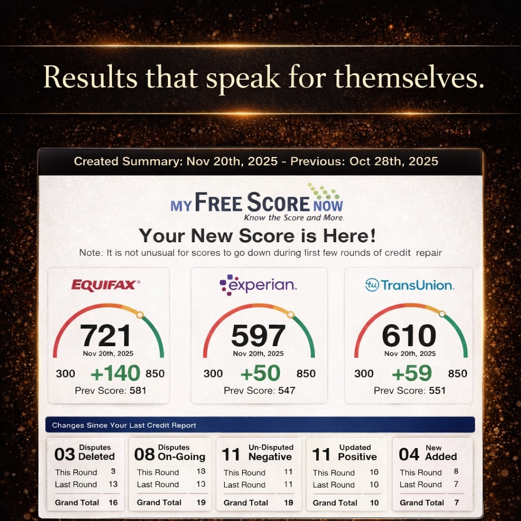 We do not guarantee specific credit score increases or the removal of negative items from your credit report. Results vary depending on each individual’s credit history, level of participation, and external factors beyond our control.