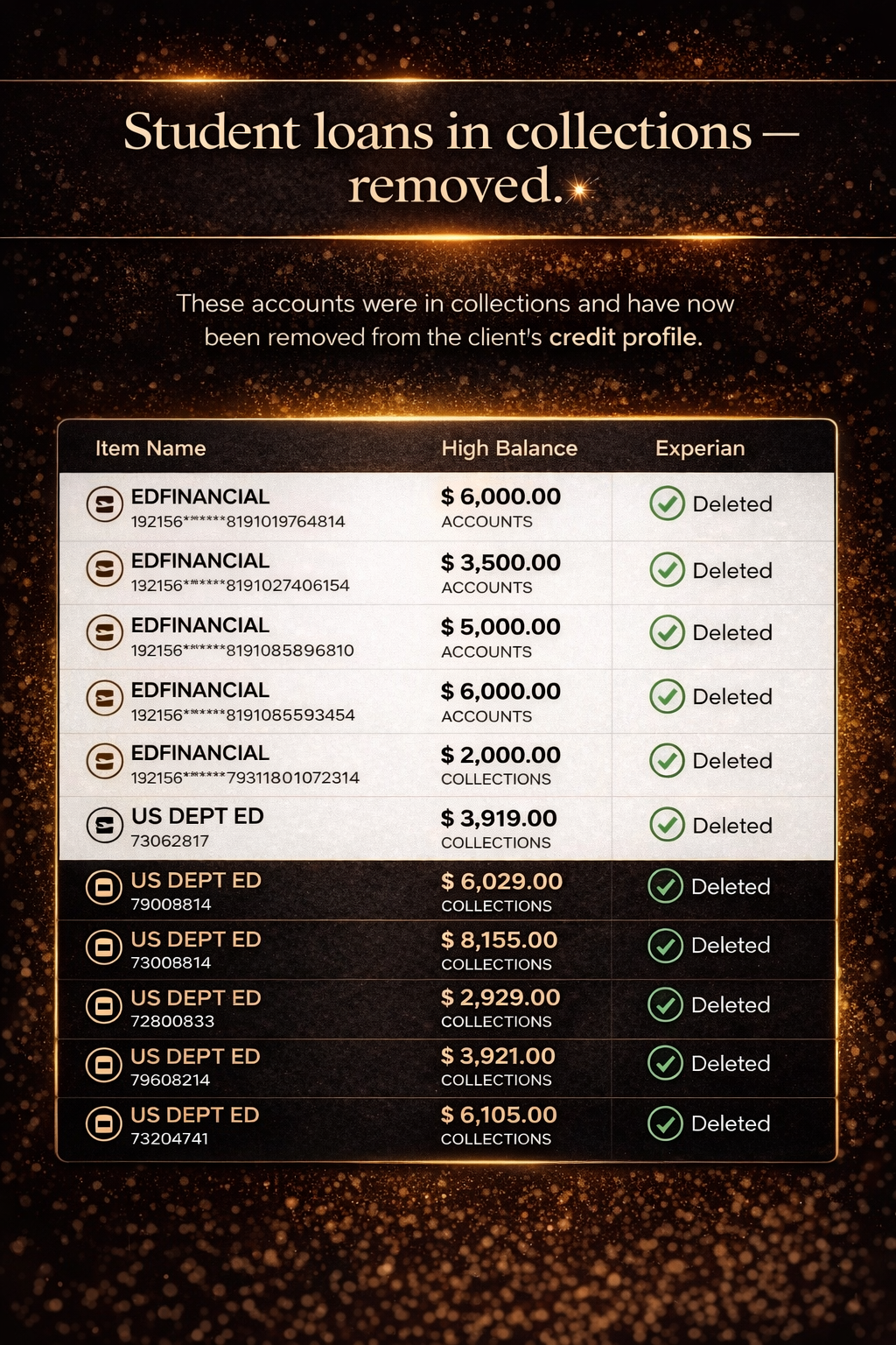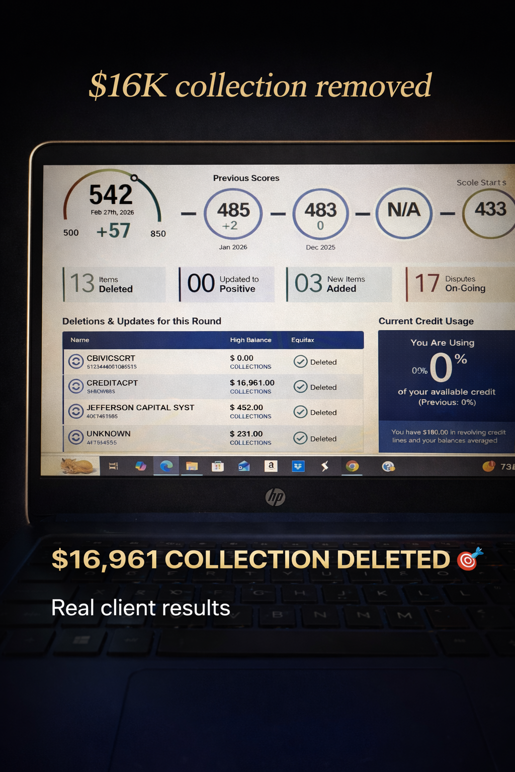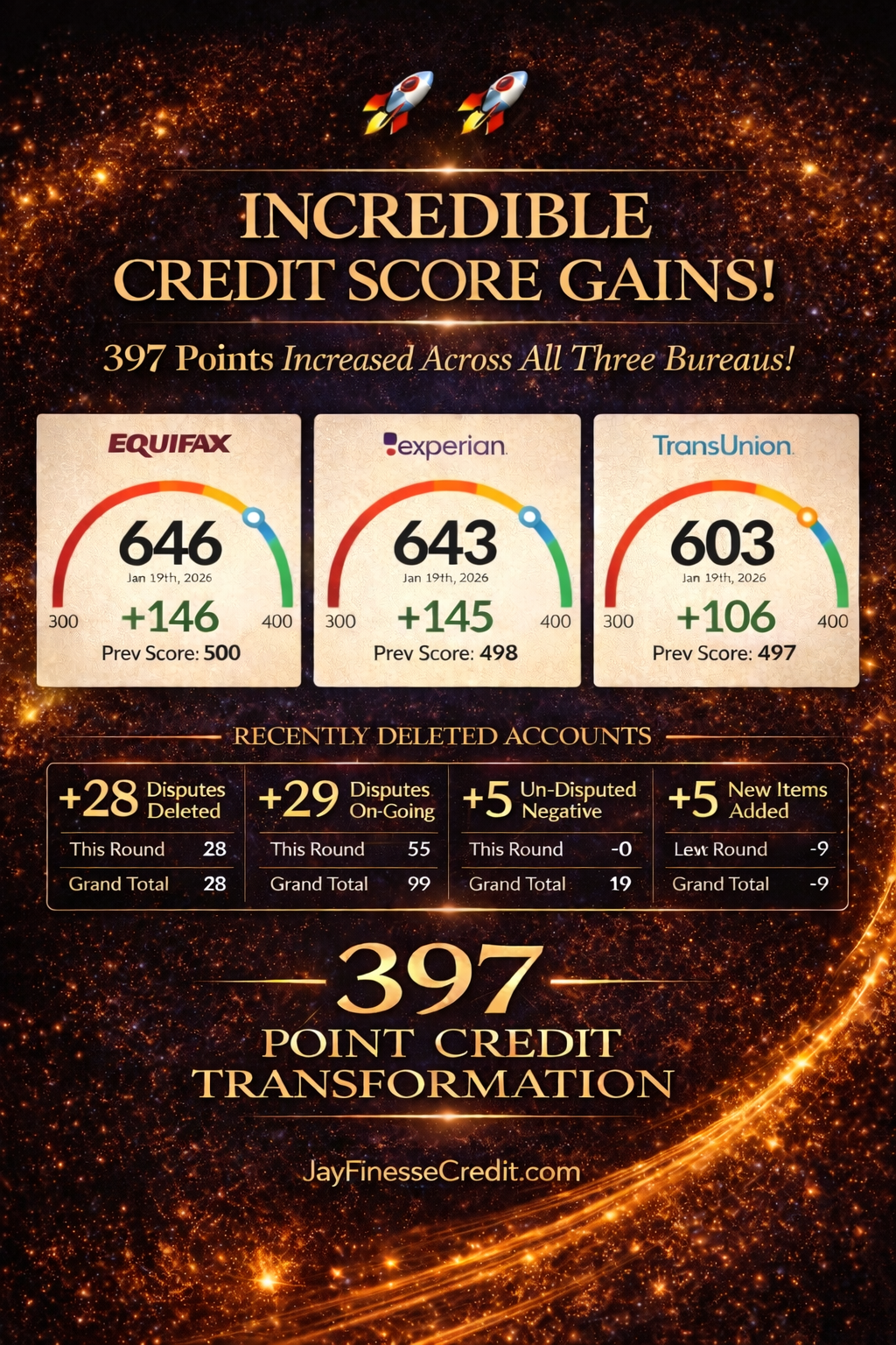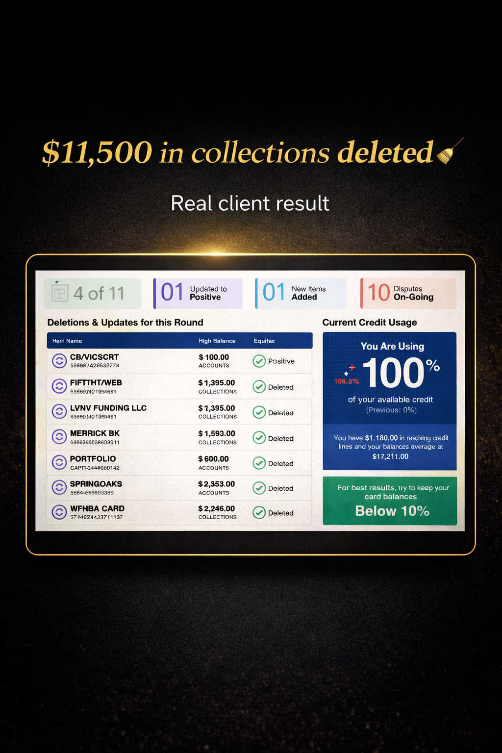We do not guarantee specific credit score increases or the removal of negative items from your credit report. Results vary depending on each individual’s credit history, level of participation, and external factors beyond our control.